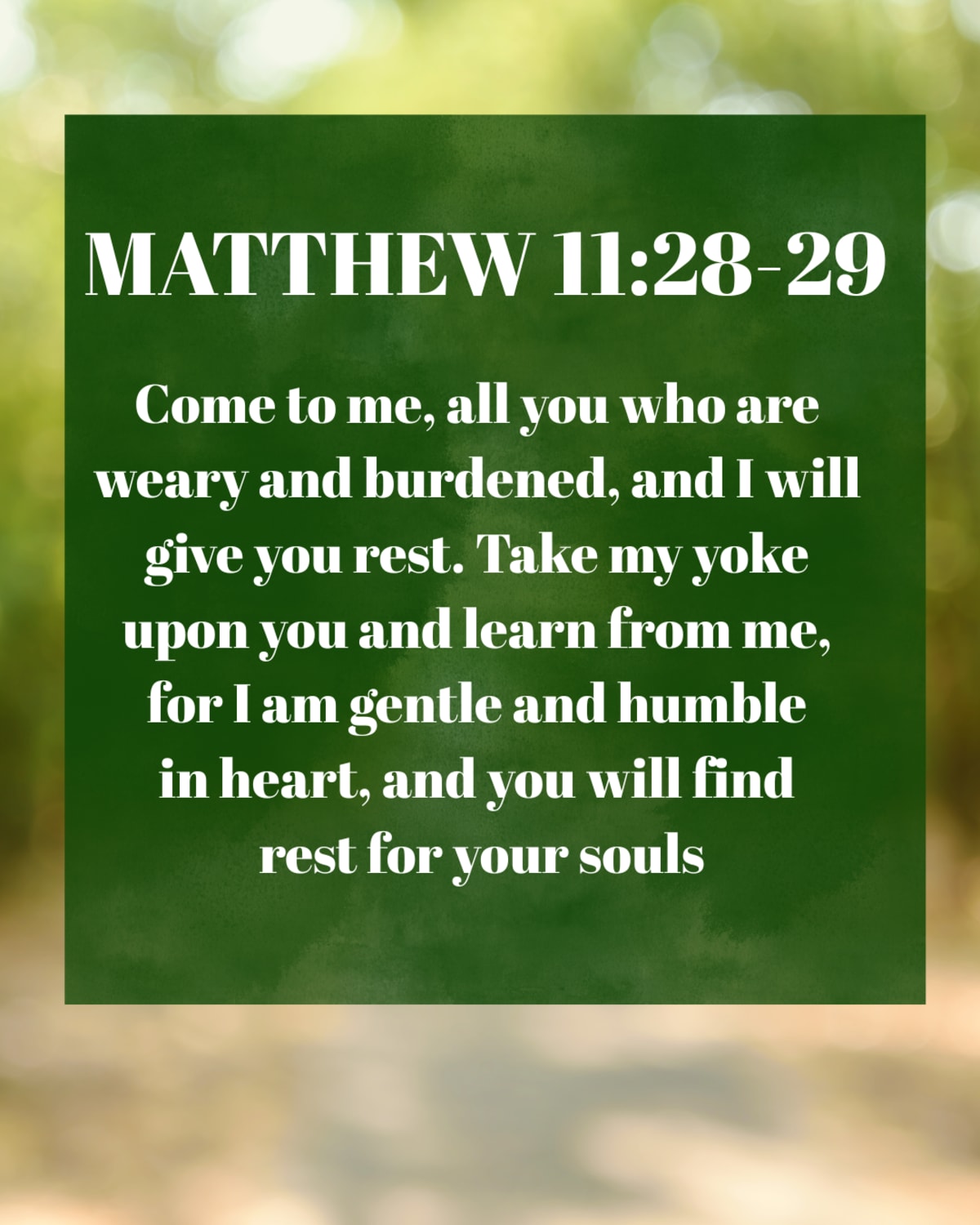 "Come to me, all you who are weary and burdened, and I will give you rest. Take my yoke upon you and learn from me, for I am gentle and humble in heart, and you will find rest for your souls." — Matthew 11:28-29 (NIV)